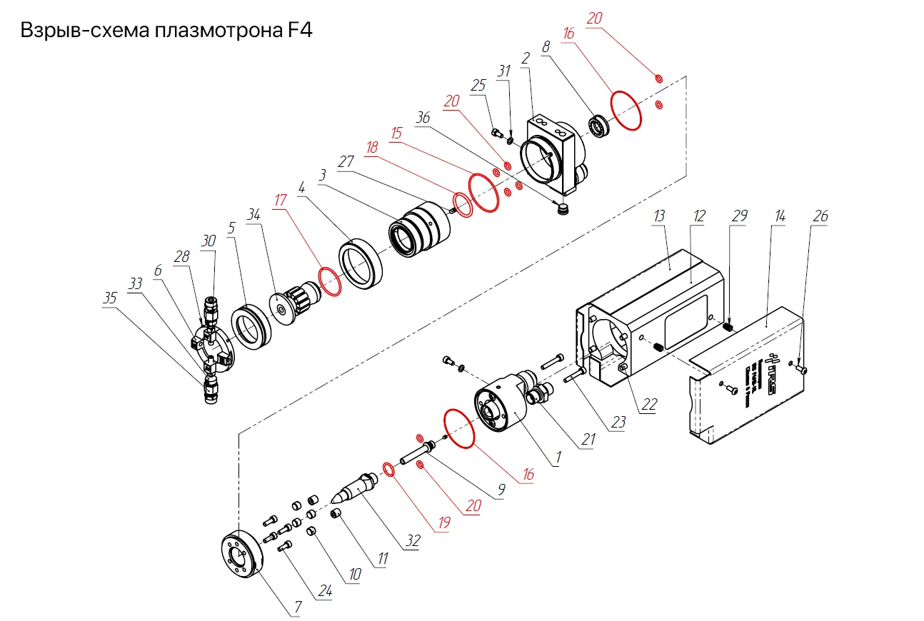 IRS-100130 Комплект уплотнительных колец для плазмотрона содержит все необходимые для работы уплотнительные кольца и состоит из позиций 15...20 (на взрыв-схеме плазмотрона F4) и из позиций 29...34 (на взрыв-схеме плазмотрона F4-90)
