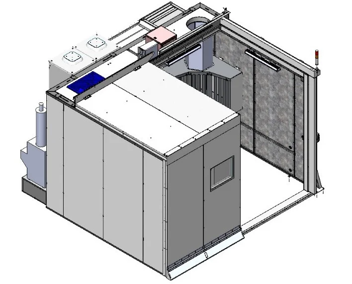 Размеры, цвет и общая планировка камеры подбираются индивидуально по требованиям Заказчика. Каждая кабина оснащается воздухозаборником с соответствующей пропускной способностью и шумоглушителем. Кабина может быть оборудована одностворчатой/двустворчатой навесной дверью или L-образной механизированной дверью для облегчения загрузки деталей с помощью мостового крана. Все двери имеют соответствующие уплотнения для обеспечения низкого уровня шумовыделения.