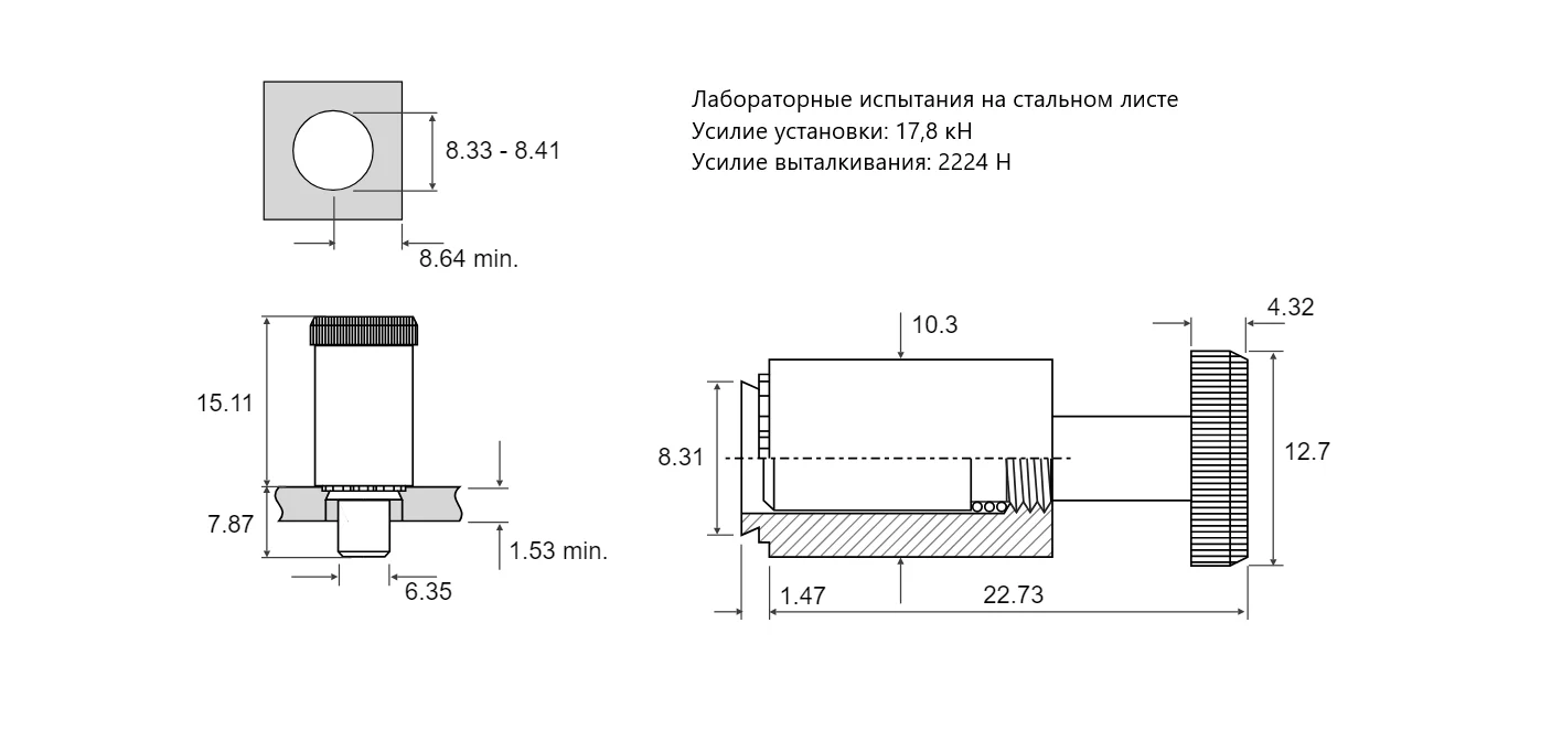 ✔ Заподлицо с обратной стороны – Плунжер в утопленном положении не выступает за плоскость листа